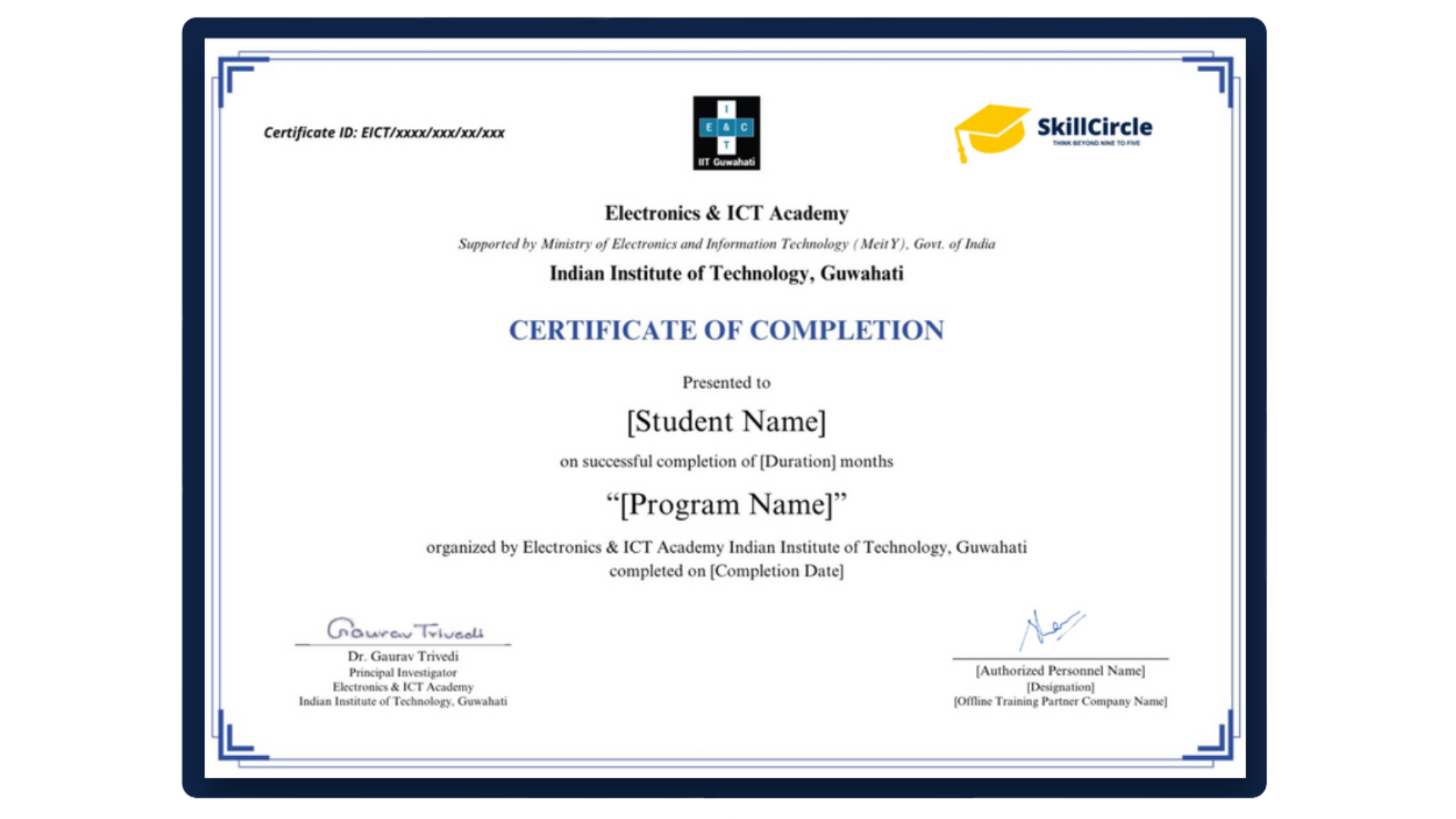 • Supported by the Ministry of Electronics and Information Technology, Govt. of India, SkillCircle proudly collaborates with E&ICT Academy, IIT Guwahati to deliver cutting-edge skill-based education and training.